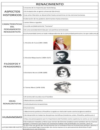 El documento resume los aspectos históricos, filósofos y pensadores, características del pensamiento renacentista e ideas renacentistas del Renacimiento. Destaca el enfoque hacia el humanismo, que permitió trascender el pensamiento de la época al ver a la humanidad como un todo independiente de las comunidades particulares, y considerar al ser humano como sujeto libre e igual.