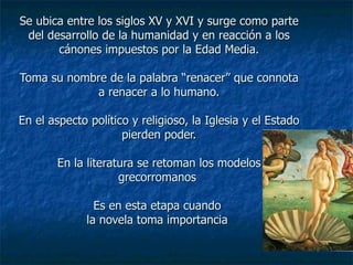 El documento describe el Renacimiento en España, incluyendo sus características principales y algunos de los autores más destacados de la época como San Juan de la Cruz, Fray Luis de León, Garcilaso de la Vega, Jorge Manrique y Sor Juana Inés de la Cruz. Se sitúa entre los siglos XV y XVI como una reacción a la Edad Media y se caracteriza por retomar los modelos clásicos y una pérdida de poder de la Iglesia y el Estado.
