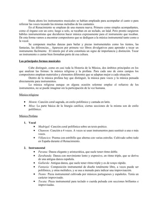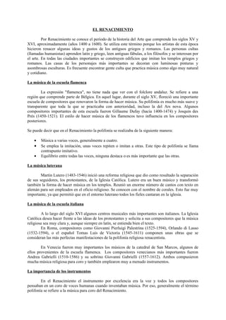 El Renacimiento fue un período entre los siglos XV y XVI en el que renacieron las ideas y gustos de la antigua Grecia y Roma. Los humanistas aprendieron latín y griego y se interesaron por el arte. La música de la época incluyó la polifónica de la escuela flamenca, la música luterana con sus corales y la música religiosa de compositores italianos como Palestrina. Los instrumentos musicales también ganaron importancia durante este periodo.