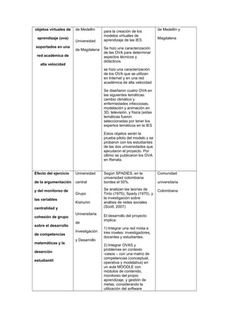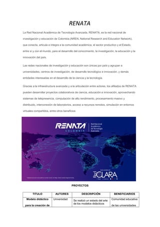 RENATA es la red nacional de investigación y educación de Colombia que conecta la comunidad académica, el sector productivo y el Estado para el desarrollo del conocimiento a través de proyectos colaborativos que aprovechan recursos como computación de alto rendimiento. Los proyectos descritos buscan crear objetos virtuales de aprendizaje, analizar factores que afectan la deserción estudiantil y desarrollar un recurso en línea para difundir información biológica y cultural de plantas colombianas.