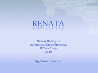 RENATA es una red académica creada por el Ministerio de Tecnología de la Información para promover la colaboración entre la comunidad académica y científica de Colombia y el mundo. RENATA ofrece servicios como video por demanda, videoconferencias y transferencia de datos a través de su plataforma virtual. Está integrada por siete redes académicas regionales distribuidas en Colombia y tiene dos tipos de miembros: titulares y de gobierno.