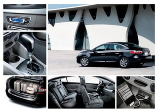 El documento proporciona una tabla comparativa del equipamiento incluido en tres versiones del Renault Fluence (Expression, Privilege y Privilege Plus). La versión Expression incluye elementos básicos de seguridad y conducción. La versión Privilege añade airbags laterales y de cortina, cierre automático, climatizador y asientos de cuero. La versión Privilege Plus ofrece todos los elementos anteriores más conectividad Bluetooth, techo solar eléctrico y tapizado completo en cuero.