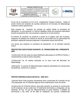 El Dr. Jorge Hernán Vergara Cardona, Secretario de Planeación del municipio de Sabanalarga Antioquia, realizó el primer informe de rendición de cuentas sectorial el 24 de noviembre de 2012 a través de la página web del municipio. El informe detalló los proyectos ejecutados durante el año y los planes para el 2013, e incluyó una sección de preguntas y respuestas con la comunidad. No se adquirieron compromisos durante el ejercicio.