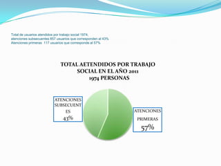 Este documento proporciona información sobre las actividades realizadas por el trabajo social en un hospital en el año 2011. Resume que se atendieron un total de 1974 personas, de las cuales 857 fueron atenciones subsecuentes (43%) y 117 fueron atenciones primeras (57%). Se detallan las diferentes gestiones, referencias, reuniones con grupos, visitas domiciliarias y programas en los que participó el trabajo social.