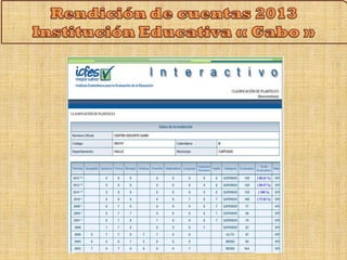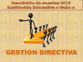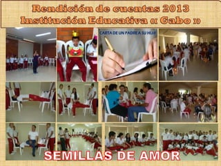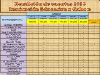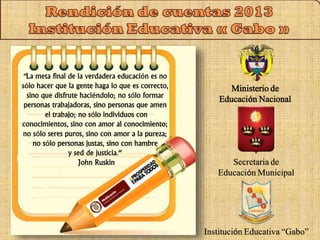 La Institución Educativa 'Gabo' convoca a una audiencia pública de rendición de cuentas del año lectivo 2013 para informar a la sociedad sobre sus acciones y resultados. Se destacan metas, logros académicos y la gestión en la atención a estudiantes con necesidades educativas especiales. Además, se presentan los resultados de actividades extracurriculares y el empeño de la comunidad educativa en mejorar la calidad educativa y la infraestructura institucional.