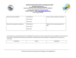 El documento describe las actividades y estrategias implementadas por la Institución Educativa 'Ciudad de Asís' para mejorar la calidad de los procesos académicos a través de la coordinación académica, basada en principios de reflexión, planeación, capacitación y participación. Se destacan reuniones periódicas, capacitaciones para docentes y estudiantes, y el uso de TIC para modernizar la enseñanza. Además, se establecen metas y indicadores para evaluar la implementación de un plan de estudios y un proyecto pedagógico orientado a estudiantes con dificultades académicas y emocionales.