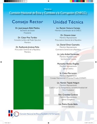 Este documento describe la Comisión Nacional de Ética y Combate a la Corrupción (CNECC) de República Dominicana. Detalla sus miembros, incluyendo su Consejo Rector y Unidad Técnica, y sus funciones de monitoreo del Plan Estratégico Nacional de Ética, Prevención y Sanción a la Corrupción. También describe la inauguración de las oficinas de la Unidad Técnica de la CNECC para fortalecer su trabajo operativo.