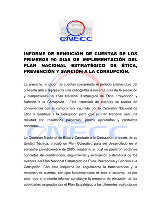 Este informe resume los logros y avances de los primeros 90 días de implementación del Plan Nacional Estratégico de Ética, Prevención y Sanción a la Corrupción en República Dominicana. Se destaca el fortalecimiento del Departamento de Prevención de la Corrupción Administrativa, la promoción del Código de Ética del Servidor Público, y el inicio de campañas de capacitación y difusión de la ética. Aún quedan actividades pendientes relacionadas con el presupuesto, personal, y reglamentación de las declaraciones jur