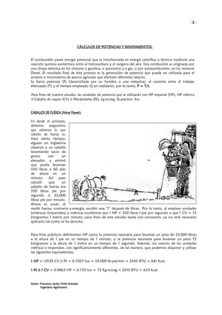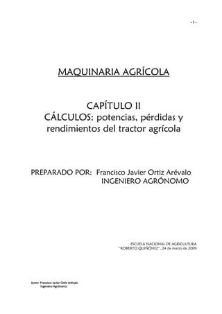 Este documento presenta cálculos relacionados con las potencias y rendimientos de un tractor agrícola. Explica cómo calcular la potencia ideal, potencia indicada, potencia al freno y potencia de fricción de un motor, usando datos técnicos del motor y del combustible. También describe cómo calcular los rendimientos térmico, térmico al freno, mecánico y volumétrico del motor, los cuales indican su eficiencia. Se provee un ejemplo numérico para cada cálculo usando datos de un motor diésel de 4 cil