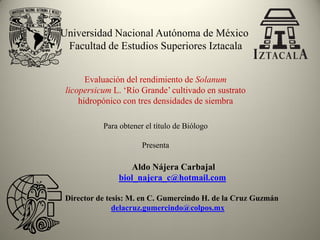Este documento presenta un estudio sobre el rendimiento de Solanum lycopersicum L. 'Río Grande' cultivado en hidroponía con tres densidades de siembra. El objetivo general fue analizar el rendimiento biológico y agronómico con diferentes densidades y contenedores. Se evaluaron variables como área foliar, número de hojas, rendimiento y relación vástago/raíz. Los resultados mostraron que el mayor área foliar y número de hojas se obtuvo con la densidad más baja de 10 plantas/m2 en mac