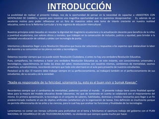 El documento propone que en los próximos tres años las instituciones educativas complementen su tecnología existente con computadoras con acceso a Internet, proyectores e interactivos en cada aula para permitir el uso de wikis, foros y libros virtuales que motiven el aprendizaje de los estudiantes. También recomienda implementar el e-learning para facilitar la educación. El objetivo es mejorar la calidad y motivación de los estudiantes a través del uso de recursos tecnológicos.