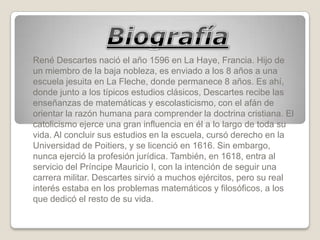 René Descartes nació en Francia en 1596 y recibió educación jesuita, enfocada en la razón y la doctrina cristiana. Aunque estudió derecho, nunca ejerció y se dedicó a problemas matemáticos y filosóficos. Descartes desarrolló el método de la duda para cuestionar todo conocimiento y encontrar certezas, lo que lo llevó a concluir que aunque puede dudar de todo lo demás, no puede dudar de que existe porque piensa.
