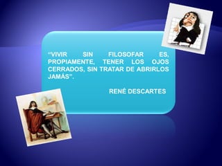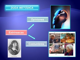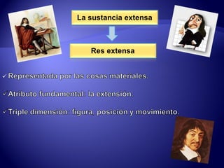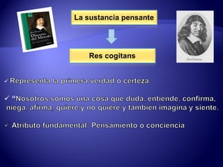 El documento resume la filosofía racionalista de René Descartes. Descartes confiaba en la razón humana para descubrir verdades universales y desarrolló el método del racionalismo. Creía en ideas innatas y buscaba un método adecuado para adquirir conocimiento cierto mediante la razón, la intuición y la deducción. Sus obras principales incluyen el Discurso del Método y las Meditaciones Metafísicas. Propuso la existencia de sustancias, incluidas la sustancia pensante (el alma) y la sustancia ext