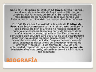 René Descartes fue un filósofo, matemático y científico francés del siglo XVII, considerado el padre de la filosofía moderna. Propuso el método cartesiano, que incluye la duda metódica y la evidencia clara y distinta como fundamentos del conocimiento, lo que llevó a su conclusión fundamental "pienso, luego existo". Defendió el dualismo antropológico, afirmando que la mente y el cuerpo son sustancias distintas, donde la mente es inmaterial e inextensa y sólo el pens