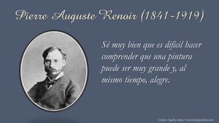 Pierre-Auguste Renoir fue un pintor impresionista francés conocido por sus escenas alegres de la vida cotidiana y sus retratos de figuras femeninas. Comenzó su carrera pintando en un estilo realista, pero luego se unió al movimiento impresionista y pintó al aire libre, usando pinceladas sueltas para capturar la luz. Más tarde desarrolló un estilo más detallado influenciado por Ingres antes de regresar a un estilo más libre en sus últimos años. Renoir buscó transmitir