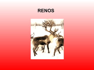 El reno es un animal que mide entre 1,80 y 2 metros de largo y 1,40 metros de altura, con cuernos en ambos sexos y pelaje grisaceo y blanco. Vive en manadas salvajes o semidomesticadas en el norte de Europa y Siberia, aunque una subespecie llamada caribú vive en América del Norte. Se alimenta de hierbas, musgos y líquenes y es apreciado por su carne, leche y como animal de tiro en el norte.