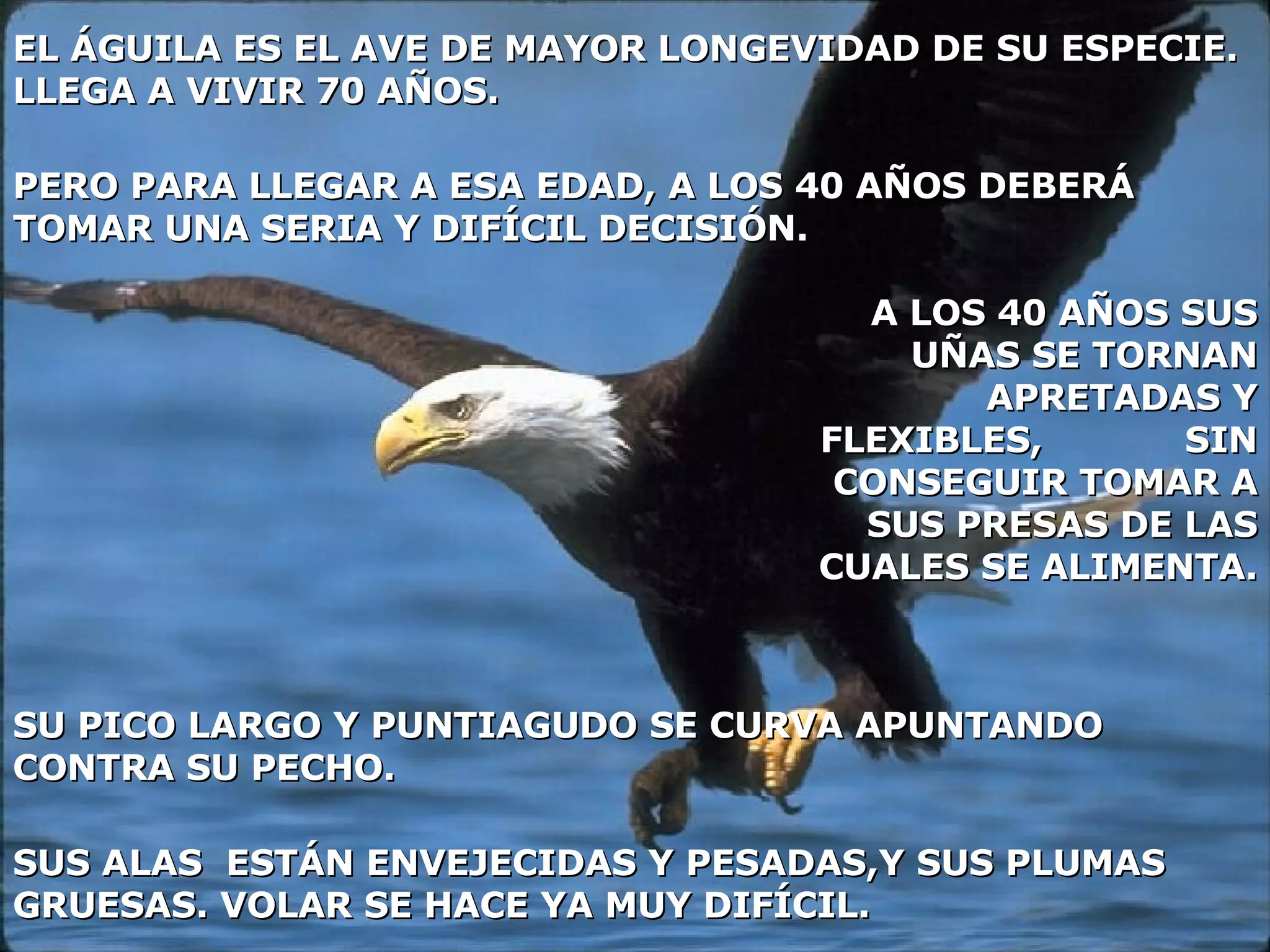 El documento describe el proceso de renovación que experimentan las águilas mayores de 40 años. Cuando sus garras y pico se vuelven inútiles para cazar, deben arrancarse el pico contra una pared y desprenderse de sus plumas viejas, un proceso doloroso de 150 días que les permite regenerarse y vivir 30 años más.