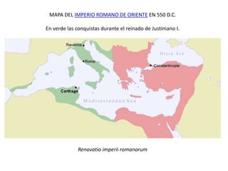 Justiniano fue el emperador del Imperio bizantino desde 527 hasta su muerte en 565. Durante su reinado buscó restaurar la grandeza del antiguo Imperio romano reconquistando territorios perdidos. Compiló el Corpus iuris civilis y promovió el cristianismo ortodoxo.