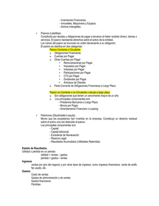 El documento proporciona información sobre estados financieros, contabilidad y componentes clave de los estados financieros como el balance general y el estado de resultados. Explica que los estados financieros ayudan a detectar situaciones críticas de las empresas y determinar su solidez financiera, y que la contabilidad recaba y resume información financiera y económica para la toma de decisiones. También define los principales elementos de un balance general como activos, pasivos y patrimonio, así como los del estado de resultados como ingresos, costos y gastos.