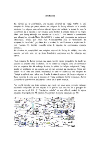 Este documento describe el funcionamiento de una máquina de Turing universal. Explica que una máquina de Turing universal puede simular cualquier otra máquina de Turing al leer tanto la descripción de la máquina a simular como la entrada. Luego detalla que una máquina de Turing está compuesta de un cabezal lector/escritor y una cinta infinita donde el cabezal puede leer, borrar y escribir símbolos siguiendo una tabla de estados. Finalmente, resume que las máquinas de Turing pueden reconocer todos los lenguajes recursivamente