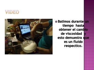 Este documento describe las propiedades de los fluidos reopécticos. Explica que los fluidos reopécticos se comportan de manera similar a los tixotrópicos, pero que su viscosidad incrementa con la velocidad de deformación hasta alcanzar un valor límite, como ocurre con los fluidos dilatantes. Usa como ejemplo la clara de huevo, cuya viscosidad aumenta con la agitación. Otras sustancias pueden mostrar propiedades reopécticas inicialmente pero volverse tixotrópicas bajo altas tensiones.