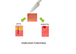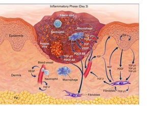 El documento describe los procesos de reparación tisular, regeneración y cicatrización. La reparación depende del tipo de tejido afectado y la lesión. La regeneración implica la proliferación celular y reconstrucción casi perfecta, mientras que la cicatrización implica la reparación a través de una cicatriz. El proceso de cicatrización involucra las fases de inflamación, proliferación celular, epitelización, formación de la matriz y remodelación.