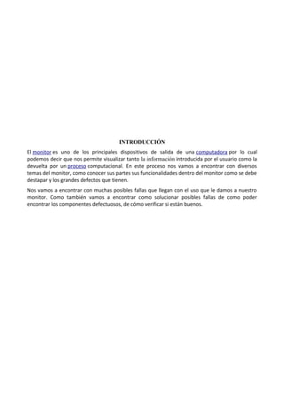 Este documento describe las partes principales de un monitor y posibles fallas y soluciones. Explica los componentes clave de una tarjeta madre de monitor como el conector DB15, conector DVI, CI Scaler y otros. Luego describe posibles fallas como que el monitor está conectado pero el LED no enciende, la pantalla no muestra imagen aunque está encendida, o la imagen es oscura. Para cada falla, explica cómo diagnosticarla y qué componentes verificar o reemplazar.