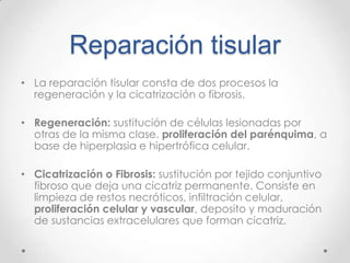 La reparación tisular consta de dos procesos: la regeneración, que implica la sustitución de células dañadas por células de la misma clase, y la cicatrización o fibrosis, que implica la sustitución por tejido conjuntivo fibroso. El proceso de reparación tisular incluye las fases de inflamación, proliferación y remodelación, durante las cuales ocurren procesos como la limpieza de restos necróticos, angiogénesis, reepitelización y depósito de colágeno