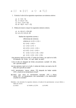 El documento presenta una serie de problemas matemáticos y de cálculo que incluyen: expresiones algebraicas, ordenamiento de números enteros, sumas y diferencias, cálculos de edades, años de nacimiento y matrimonio, temperaturas, y aproximaciones y raíces cuadradas.