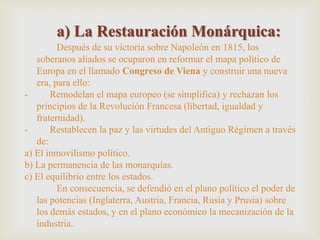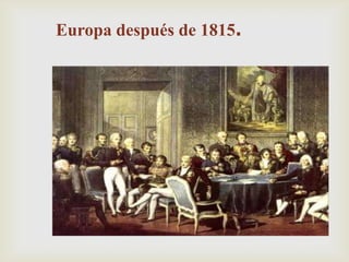 El documento describe los principales eventos y procesos en Europa y el mundo entre 1815 y 1939. Tras la derrota de Napoleón en 1815, los monarcas restauraron el Antiguo Régimen en Europa y rechazaron los principios de la Revolución Francesa. Entre 1870 y 1914, el nacionalismo creció en Europa y las potencias imperialistas expandieron su poder colonialmente en África, Asia y otras partes, lo que generó rivalidades y dependencia económica. La Primera Guerra Mundial estalló en 1914.