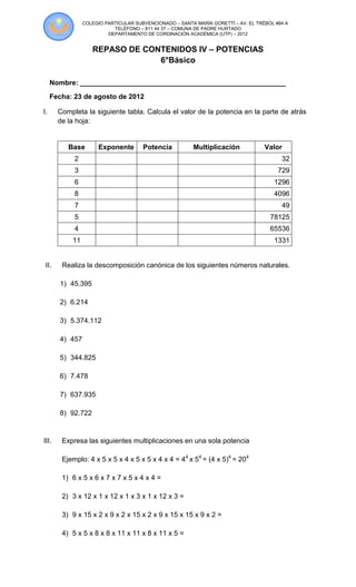 El documento es un examen de repaso de contenidos de matemáticas para 6° básico. Contiene 5 secciones con ejercicios sobre potencias, descomposición canónica de números naturales, expresar multiplicaciones como potencias, divisiones de potencias de 10 y un problema sobre cóndores en Sudamérica.