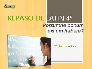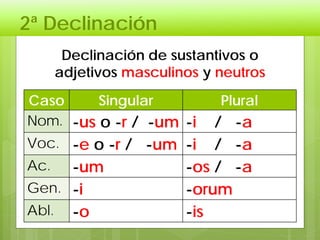 El documento presenta la declinación de sustantivos y adjetivos de la segunda declinación en latín. Explica las formas de los casos nominativo, vocativo y acusativo en singular y plural, ilustrando con ejemplos de sustantivos como "dominus", "puer" y "magister", y adjetivos como "altus" y "miser". También incluye ejercicios de conjugación y preguntas sobre la aplicación de los casos.