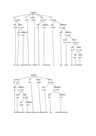 El documento consiste en una serie de oraciones que ejemplifican distintas estructuras gramaticales y tipos de oraciones en español. Además, se muestran situaciones cotidianas y expresiones emocionales. Se enfatiza el uso de la gramática en contextos diversos, incluyendo reportes de eventos y relaciones interpersonales.