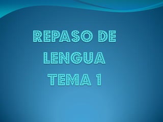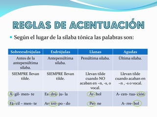 Este documento contiene información sobre las reglas de acentuación en español, incluyendo los tipos de palabras según la sílaba tónica y cuándo llevan tilde. También define los conceptos de texto, párrafo y enunciado, y explica la diferencia entre oración y frase. Por último, describe diferentes tipos de diccionarios y usos de la lengua, además de los principales géneros literarios.