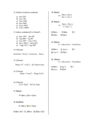 Este documento presenta una serie de ejercicios de trigonometría. 1) Hallar el valor de una función trigonométrica dadas las condiciones. 2) Calcular el valor de una expresión trigonométrica dada una figura. 3) Determinar a qué cuadrante pertenece un ángulo dado los valores de dos funciones trigonométricas.