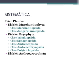 Este documento proporciona una revisión sistemática de las plantas no vasculares. Comienza describiendo la clasificación de las plantas no vasculares en tres divisiones: Marchantiophyta (hepáticas), Bryophyta (musgos) y Anthocerotophyta. Luego describe las características generales de cada división, incluida la estructura y función de sus gametofitos y esporofitos. Finalmente, resume brevemente las características de otras divisiones de plantas no vasculares como Lycopodiophyta, Psilotophyta y algunas