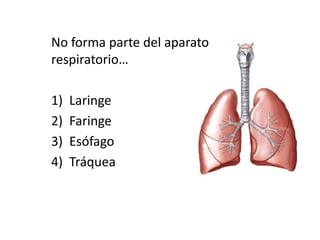 El documento resume las partes principales del aparato respiratorio humano, incluyendo la laringe, faringe, tráquea, bronquios, pulmones y pleura. Explica detalles como que el pulmón izquierdo solo tiene dos lóbulos, mientras que el peso aproximado de los pulmones es de 1200 gramos, y que la pleura está compuesta por la pleura visceral y la pleura parietal.