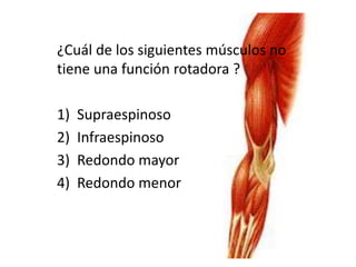 Este documento contiene preguntas sobre los músculos de los miembros superiores. Pregunta sobre cuál músculo no tiene función rotadora (redondo menor), cuál movimiento no realiza el doltoides (rotación interna), dónde se inserta el supraespinoso (troquíter), cuál es el principal flexor del brazo (bíceps braquial), qué nervio inerva al deltoides (n. axilar) y cuál es la principal función del bíceps braquial (flexión del codo).