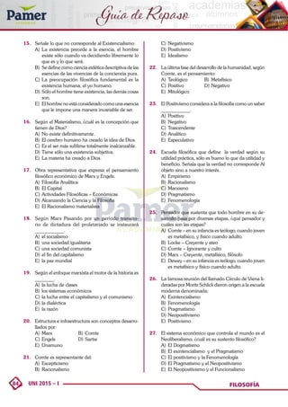 El documento es una guía de repaso sobre diversas corrientes y conceptos filosóficos, abarcando desde el idealismo de Hegel y el materialismo de Marx, hasta el existencialismo y el positivismo. Incluye preguntas y respuestas relacionadas con filósofos, obras y teorías, proporcionando un resumen educativo de la filosofía contemporánea y clásica. La guía también aborda temas como la ética, la epistemología, y la relación entre conocimiento y realidad.