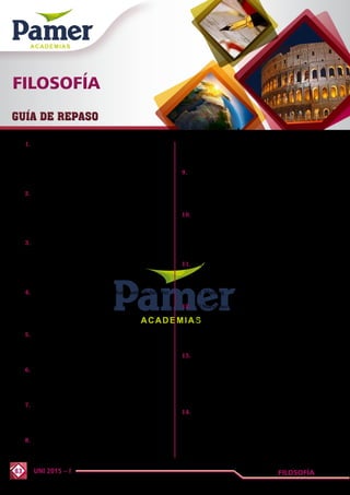 El documento es una guía de repaso sobre conceptos y filósofos clave en la filosofía, abordando temas como el idealismo, materialismo, existencialismo y diversas corrientes filosóficas. Incluye preguntas de opción múltiple acerca de pensadores como Hegel, Marx, Schopenhauer y Nietzsche, así como sus teorías y obras más importantes. Se trata de un recurso educativo destinado a estudiantes que buscan consolidar su conocimiento en filosofía.