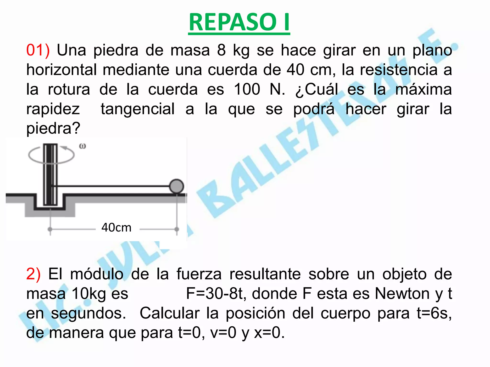 El documento contiene 4 problemas de física. El primero involucra calcular la máxima velocidad tangencial de una piedra de 8 kg que gira en un plano horizontal usando una cuerda de 40 cm cuya resistencia a la rotura es de 100 N. El segundo problema pide calcular la posición de un objeto de 10 kg después de 6 segundos dado que la fuerza sobre él es F=30-8t. El tercer problema busca encontrar el valor mínimo de la fuerza F para que un bloque se mantenga en reposo sobre un carro. El cuarto problema