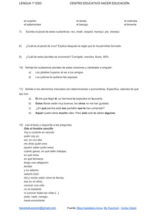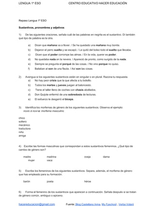Este documento contiene un repaso de lengua española para primero de la ESO. Incluye ejercicios sobre sustantivos, pronombres, adjetivos y acentuación. Los ejercicios cubren temas como la identificación de sustantivos, su género y número; formación del femenino y plural de sustantivos; uso de pronombres personales, posesivos, demostrativos y relativos; clasificación y comparación de adjetivos; y reglas de acentuación.