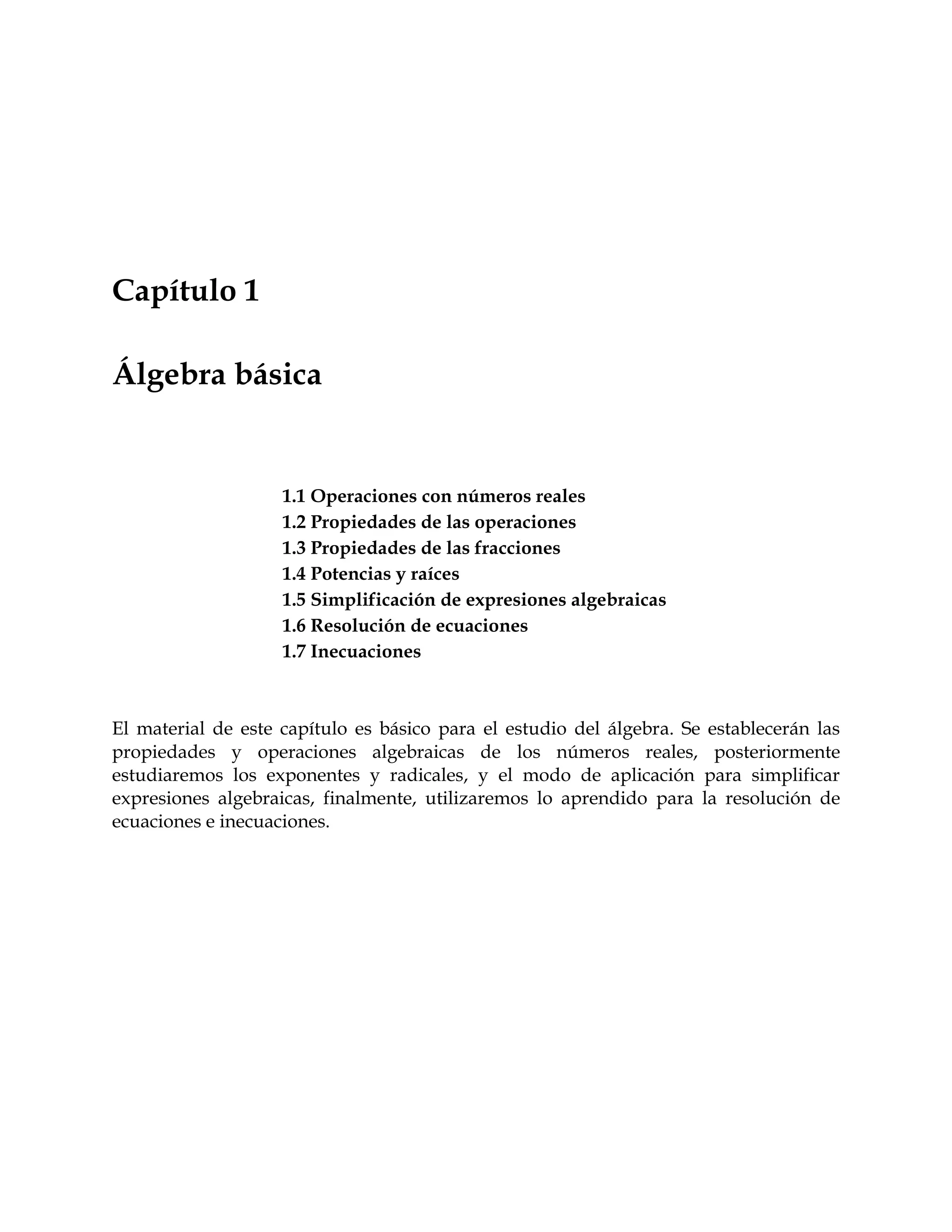 Este capítulo presenta conceptos básicos de álgebra como operaciones con números reales, propiedades de operaciones, fracciones, potencias, raíces y ecuaciones. Se definen adición, multiplicación, sustracción y división. Luego, se explican propiedades como conmutativa, asociativa, elementos neutros y distributiva. Finalmente, se cubren temas de fracciones, potencias, raíces y sus propiedades antes de introducir ecuaciones y resolución de éstas.