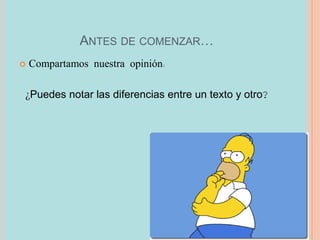 Este documento presenta los elementos fundamentales del género narrativo como la introducción a un taller sobre narrativa. Explica conceptos como el narrador, los personajes, el tiempo y el espacio en una narrativa. Define diferentes tipos de narradores como el protagonista, testigo u omnisciente. También describe los personajes principales, secundarios y terciarios y cómo se relacionan con la trama. Finalmente, distingue entre el tiempo de la historia, el tiempo del relato y el tiempo referencial.