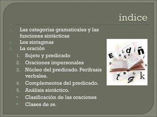 El documento habla sobre la sintaxis y sus elementos constitutivos. Explica las categorías gramaticales y funciones sintácticas, los sintagmas y sus tipos, y la oración como unidad sintáctica formada por sujeto y predicado. Define los complementos del predicado y clasifica las oraciones según su estructura.