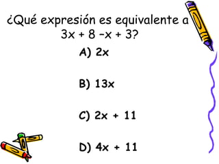 ¿Qué expresión esequivalente a 3x + 8 –x + 3? A) 2x B) 13x C) 2x + 11 D) 4x + 11