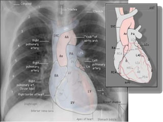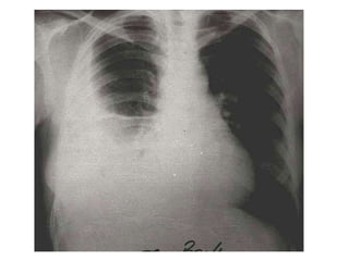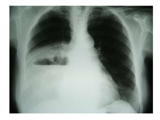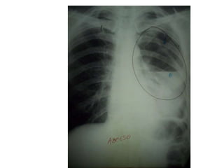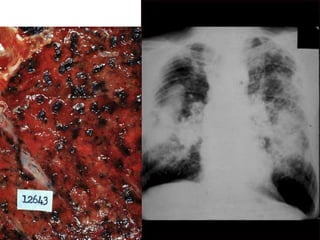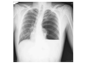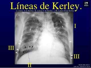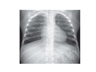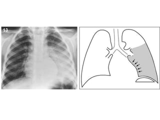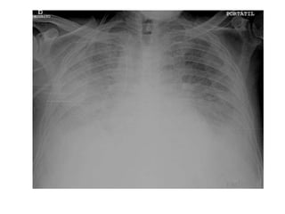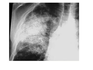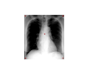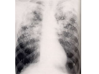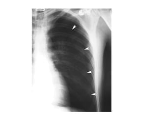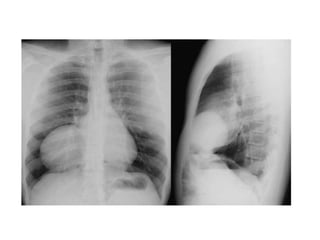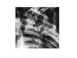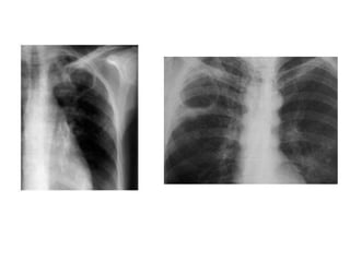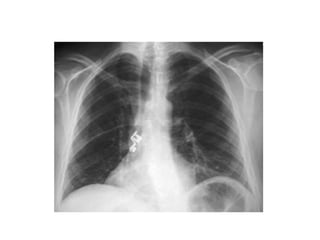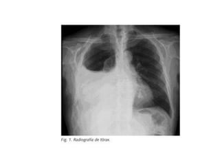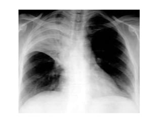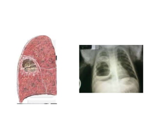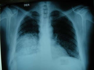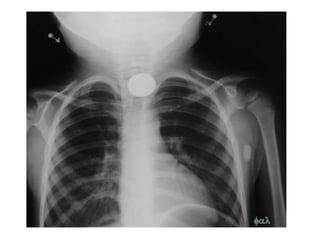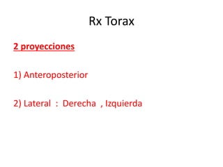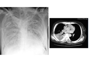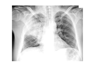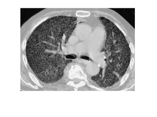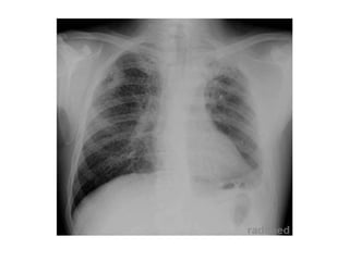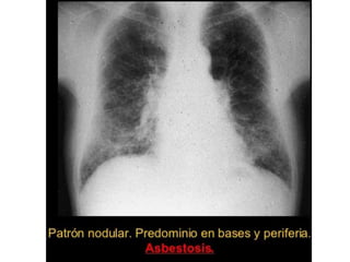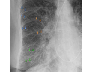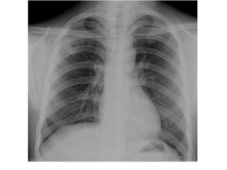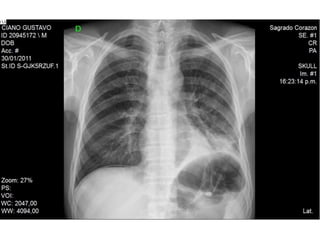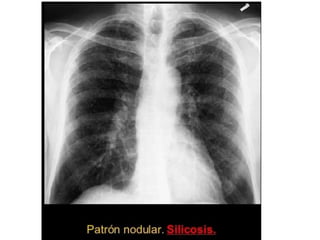 Este documento proporciona información sobre la formación de imágenes en radiología y patrones pulmonares comunes. Explica cómo la densidad de los tejidos afecta la penetración de los rayos X y cómo se evalúan las estructuras torácicas en una radiografía de tórax normal. Además, describe varios patrones pulmonares como alveolar, intersticial, destructivo y mixto, así como signos de afecciones como neumonía, edema pulmonar y atelectasia.