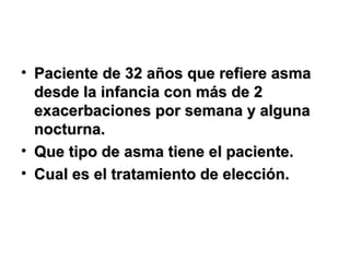 El documento presenta varios casos clínicos de pacientes con diferentes cuadros respiratorios. Se detallan los síntomas, antecedentes y exámenes realizados a cada paciente, y se solicita proporcionar el diagnóstico presuntivo, métodos de diagnóstico y tratamiento en cada caso.