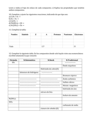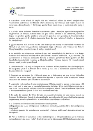 El documento contiene 10 problemas de física y química sobre temas como cinemática, dinámica, presión, densidad, reacciones químicas, estructura atómica y nomenclatura. Los problemas abarcan calcular alturas, velocidades, fuerzas, masas, volúmenes de gases, productos químicos y completar tablas periódicas y reacciones químicas.