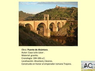 Este documento resume varias obras arquitectónicas y escultóricas romanas notables. Incluye puentes, teatros, anfiteatros y acueductos construidos entre los siglos I a.C. y II d.C., así como estatuas de emperadores y otros personajes importantes realizadas en mármol o bronce. La mayoría de estas obras se localizan en Italia, especialmente en Roma, aunque también hay ejemplos en España, Francia y otras provincias del imperio romano.